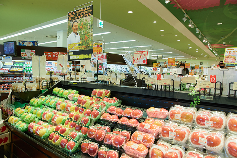 旬の野菜や果物を取り扱っています。効率化を図るため一部商品はセンター加工となっていますが、多くの商品は店内にてカットや包装作業を行っています。野菜や果物ならではの色合いや鮮度感を失わないための陳列方法には、季節に合わせた売り場づくりが必要です。また、季節により入荷日の朝採れた野菜の販売も行っています。