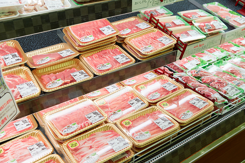 精肉や加工肉を取り扱っています。厚切りの肉は手切り、薄切りの肉はスライサーにて加工をします。現代でのニーズを踏まえ、ハーフデリカ(半調理)商品の開発も積極的に行っております。冷凍品が出回ることの多い「ひき肉」も、店内でミンチにすることで一切冷凍せず提供することが出来ています。
